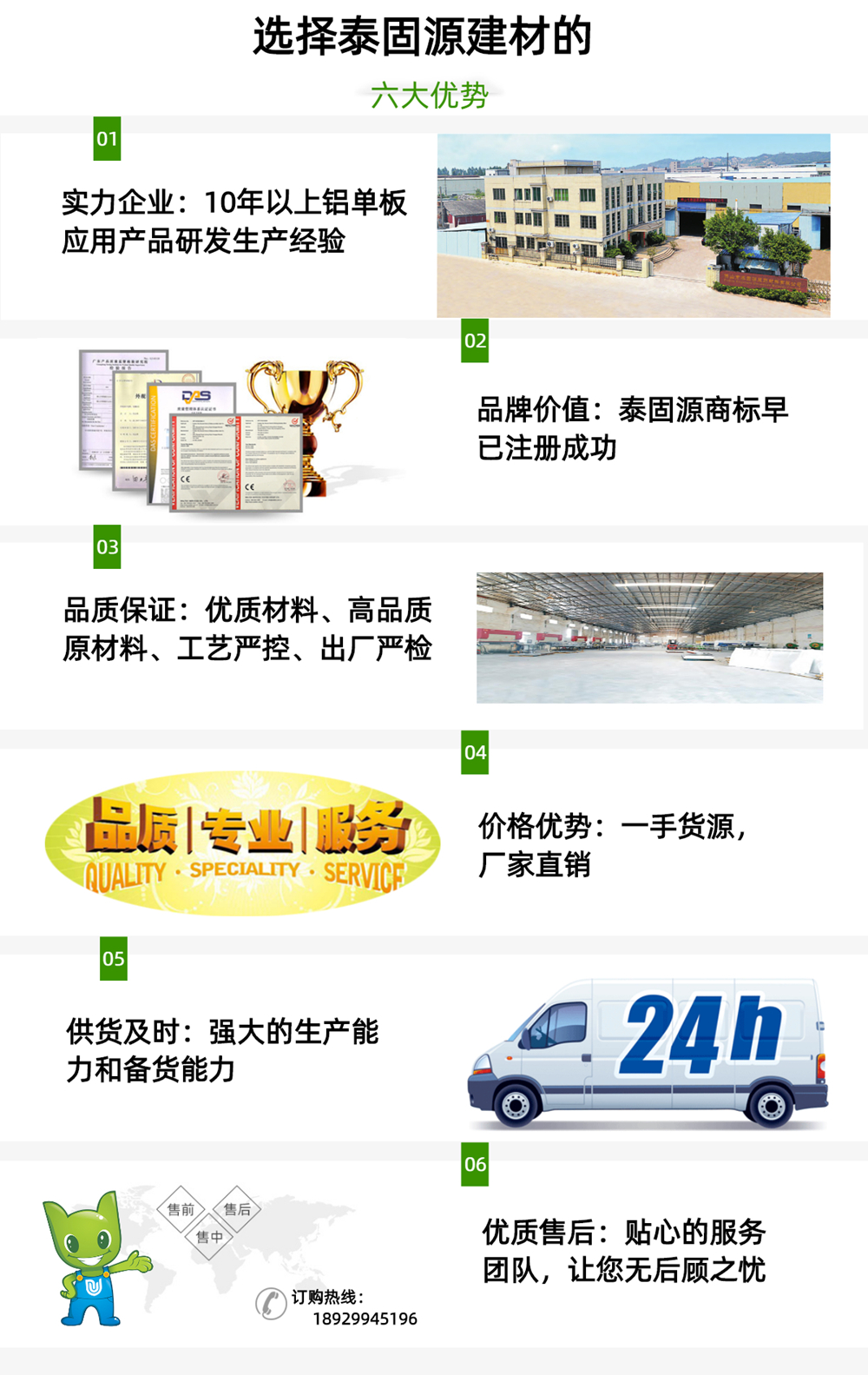 佛山市泰固源裝飾材料有限公司是一家研發、生產鋁單板和陶土板、航空板三大系列的大型企業。公司成立于二零一零年,鋁單板占地面積10000平米,陶土板占地面積300畝。擁有環境優雅、寬敞、明亮的現代化標準廠房及辦公大樓。位于佛山市南海區里水勝利工業園,地理位置優越。我司技術實力強大,生產管理科學嚴謹。它在引進意大利生產設備的基礎上,立足于持續革新制造工藝,使各項技術指標遠遠超出國家及行業標準,跨入先進水平行列,在經濟和社會效益方面取得了巨大的成就。我司自主研發、生產泰固源鋁單板,泰固源陶土板這兩大系列產品,多年來,經過公司全體員工的通力協作,我們的品牌產品(泰固源,辛源牌)得到業內人士一致認可。銷售網點遍布國內,并與諸多國內外客戶建立了長期友好的合作關系,產品銷往國內并走向世界